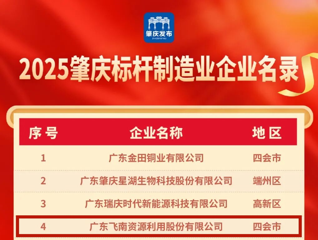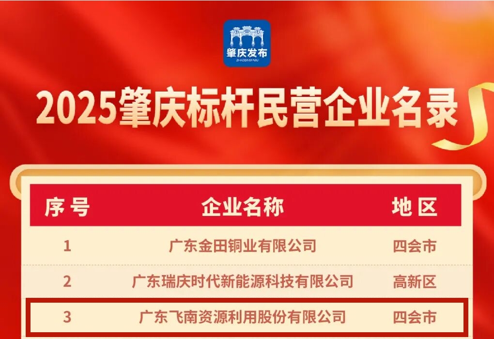 廣東飛南資源利用股份有限公司憑借卓越的綜合實力與行業(yè)貢獻,一舉斬獲“2025肇慶標桿企業(yè)”、“2025肇慶標桿民營企業(yè)”、“2025肇慶標桿制造業(yè)企業(yè)”三大重量級稱號,充分彰顯了企業(yè)在區(qū)域經濟發(fā)展中的領軍地位與示范作用。